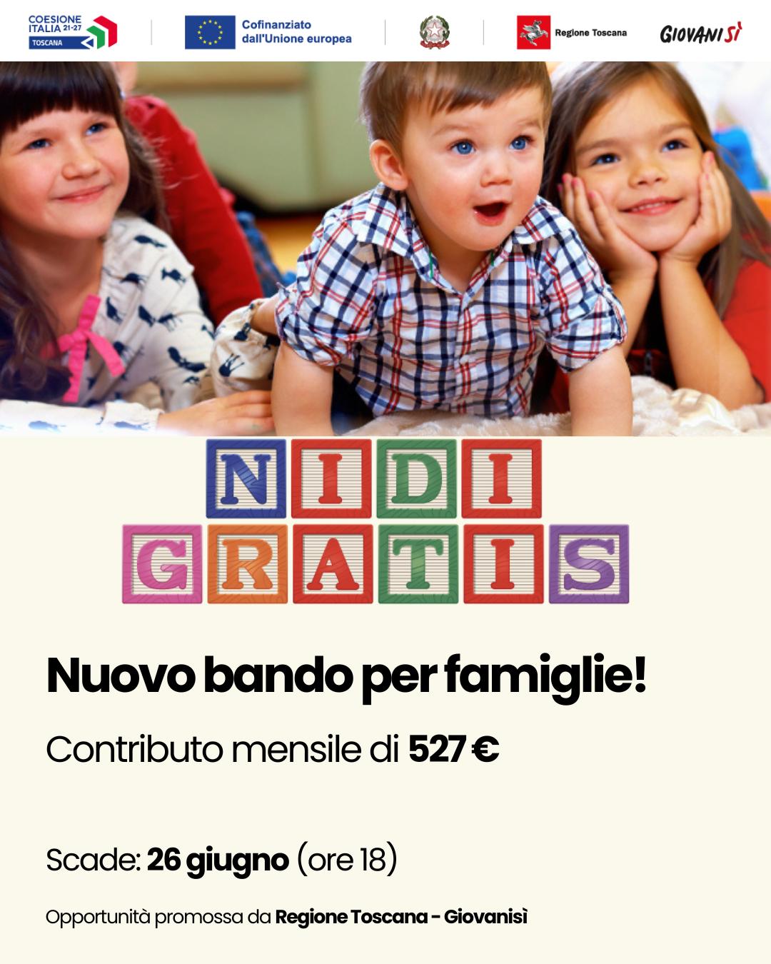 "plaintext": "Inoltre, fino al 26 giugno 2025\u00a0\u00e8\u00a0possibile presentare domanda per \u201cNidi Gratis\u201d , la misura promossa dalla Regione Toscana con il progetto Giovanis\u00ec, che consente alle famiglie in possesso dei requisiti di ottenere un abbattimento totale della retta, fino ad un massimo di\u00a0527,27 euro al mese per 11 mensilit\u00e0."