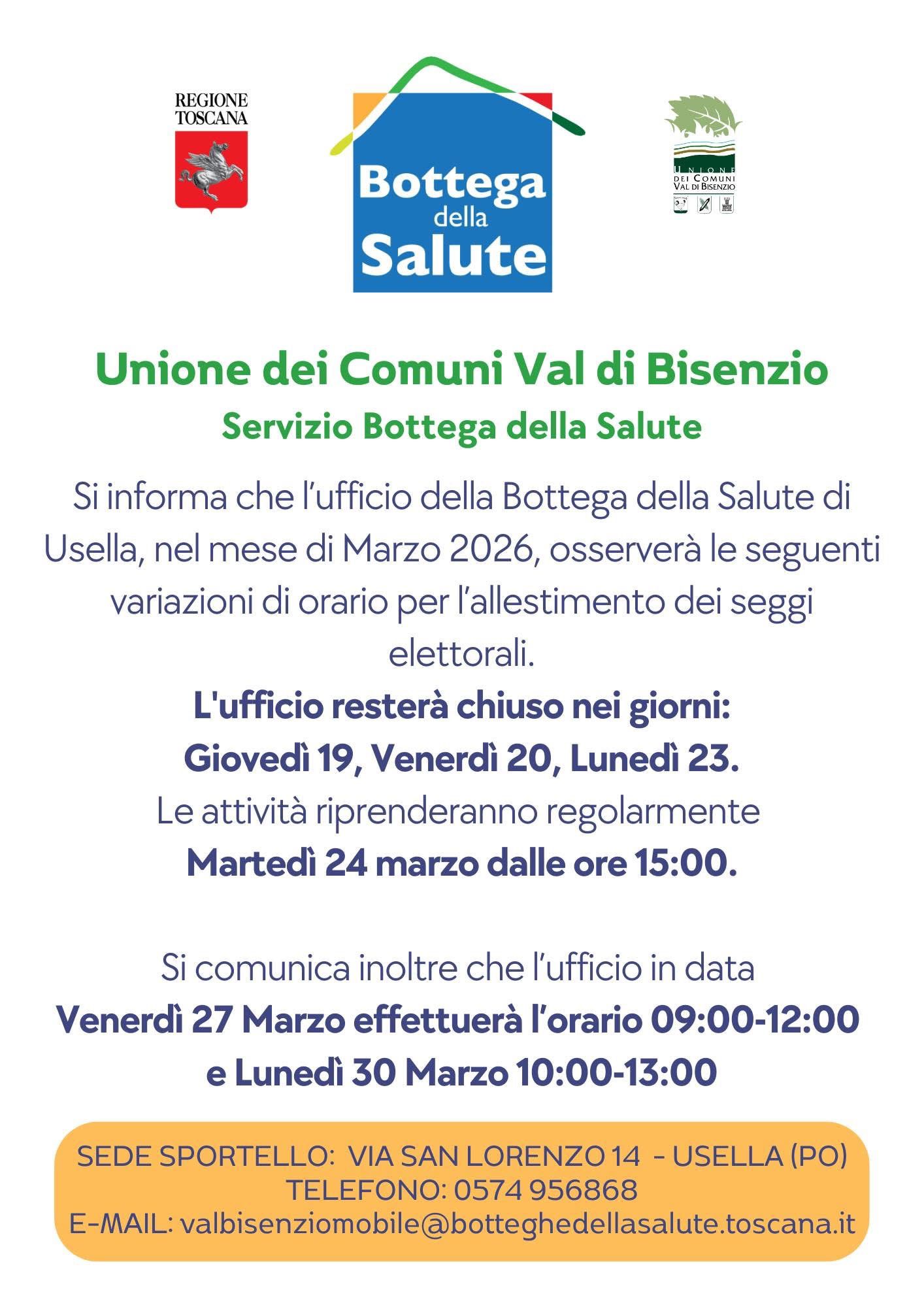 Cantagallo, 18 marzo 2026 - Si informa la cittadinanza che l’ufficio della Bottega della salute di Usella, nel mese di marzo 2026, osserverà alcune variazioni di orario in occasione dell’allestimento dei seggi elettorali.