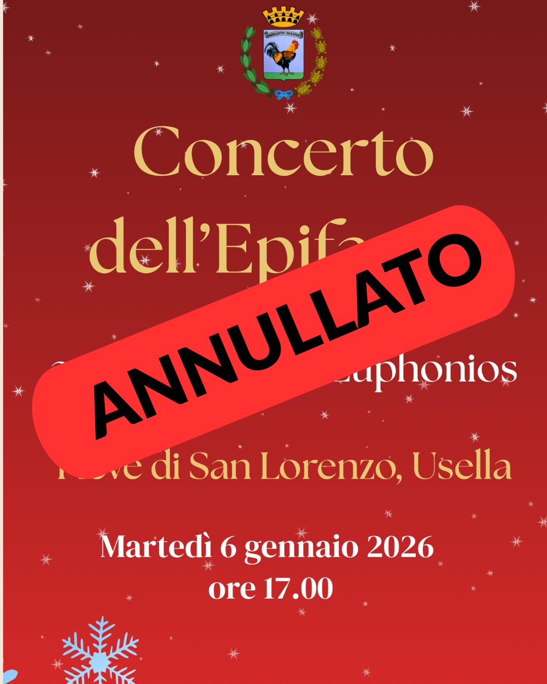 Cantagallo, 6 gennaio 2026 -Causa meteo avverso (con rischio ghiaccio nelle ore serali/notturne(, 𝐢𝐥 𝐂𝐨𝐧𝐜𝐞𝐫𝐭𝐨 𝐝𝐞𝐥𝐥’𝐄𝐩𝐢𝐟𝐚𝐧𝐢𝐚 previsto oggi, 6 gennaio, 𝐚𝐥𝐥𝐞 𝐨𝐫𝐞 𝟏𝟕, alla 𝐏𝐢𝐞𝐯𝐞 𝐝𝐢 𝐒𝐚𝐧 𝐋𝐨𝐫𝐞𝐧𝐳𝐨 𝐚 𝐔𝐬𝐞𝐥𝐥𝐚 è rinviato a data da destinarsi.